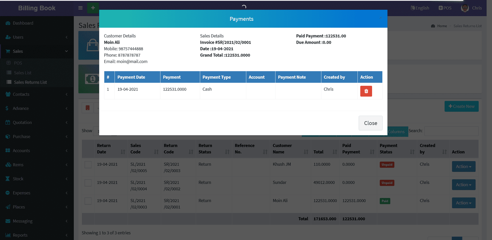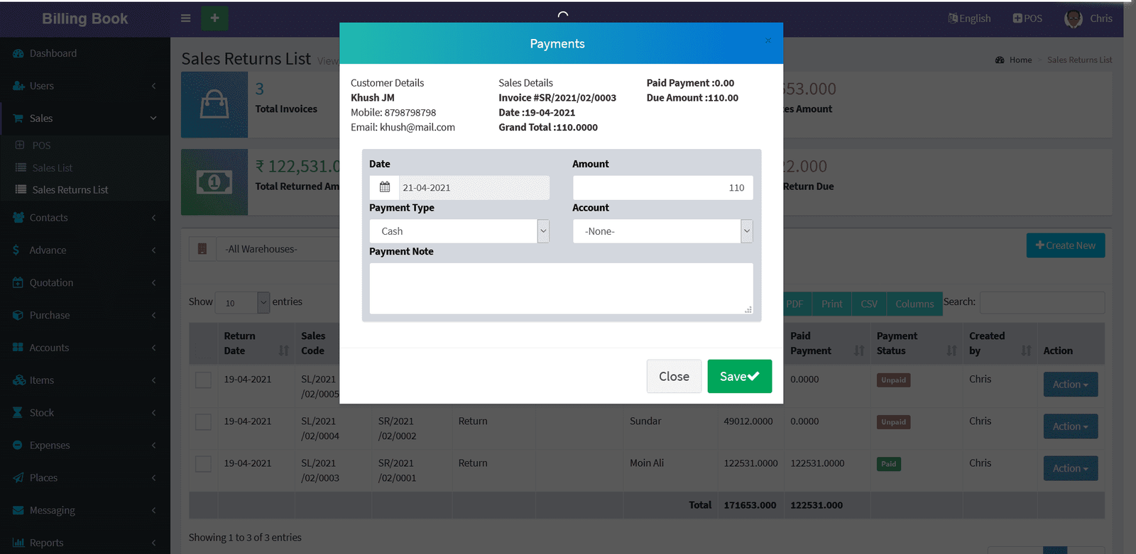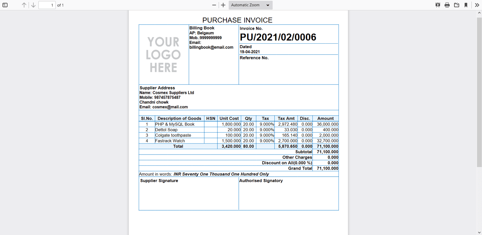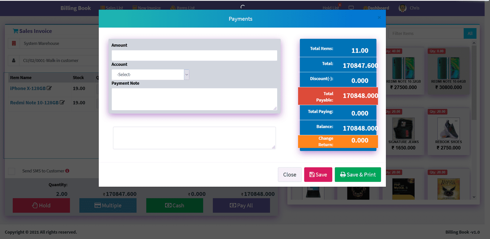 Billing Book is a PHP based web application software, where user can track and manage Items & Stock, Suppliers, Customers, Items Categories, Sales Invoice, Purchase Invoice, users and get all the reports which are require to your office with many more features. You can create any number of Warehouses and Users.