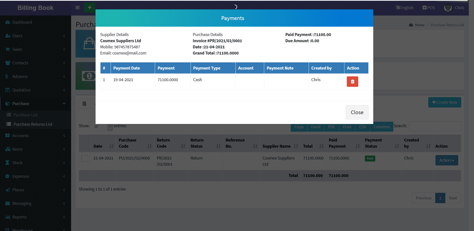 Suppliers -> Suppliers List -> Action Button -> Return Due Payments