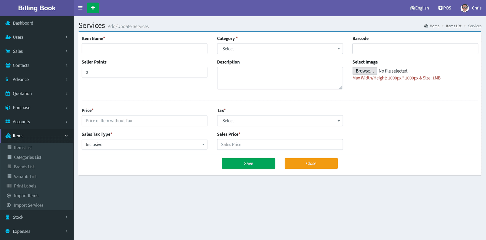 Adding a Service it's a very easy task. Enter Service or Item name, Select Category, Select Image(Optional field), Price(Without Tax), Select Tax, Tax Type(Inclusive / Exclusive) and click on Save button.