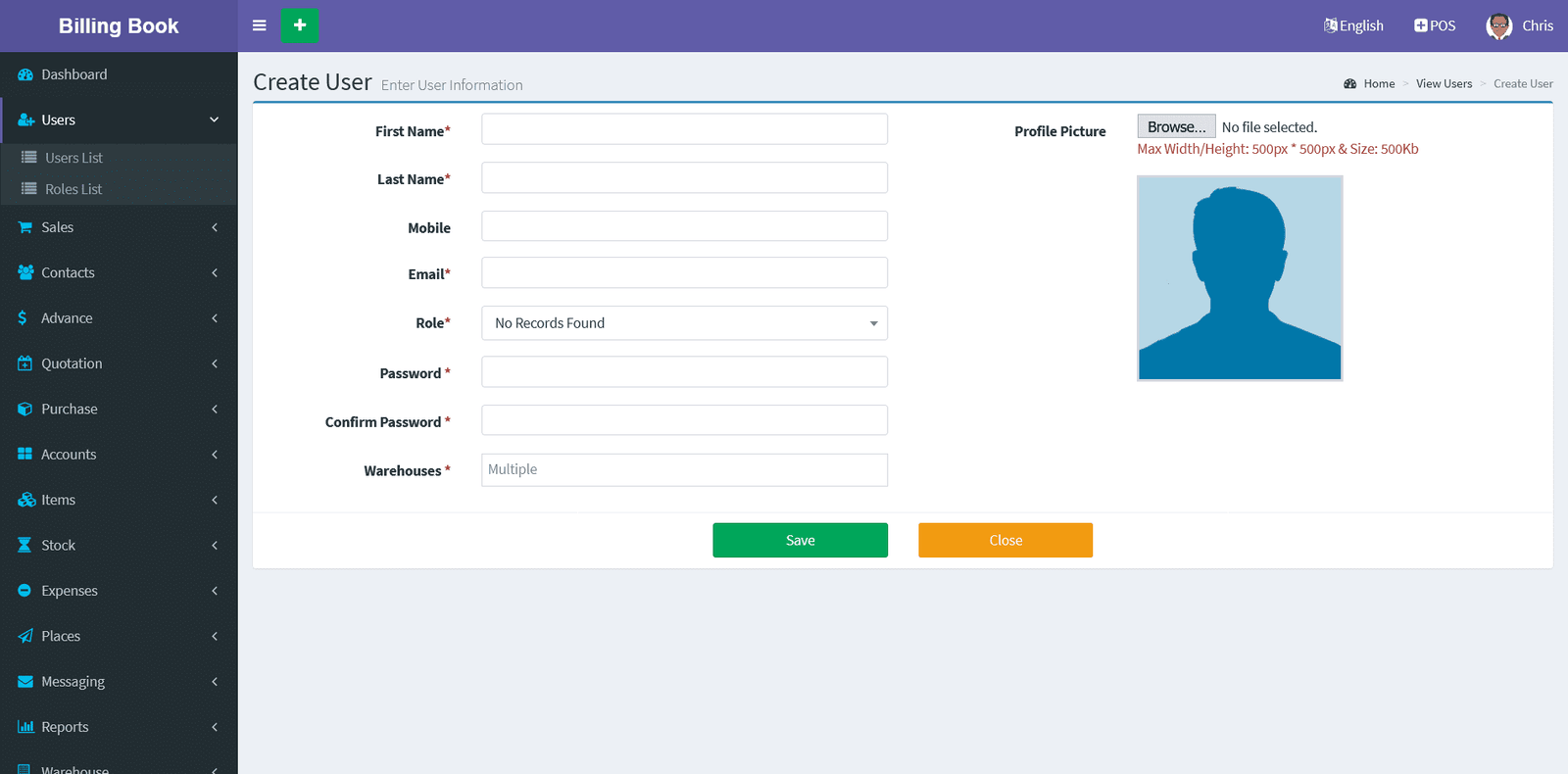 Adding a User it's a very easy task. Enter user name, Mobile number, Email ID, Role(Admin/Sales/Purchase), enter password and confirm the password fields of the new user and click on Save button.