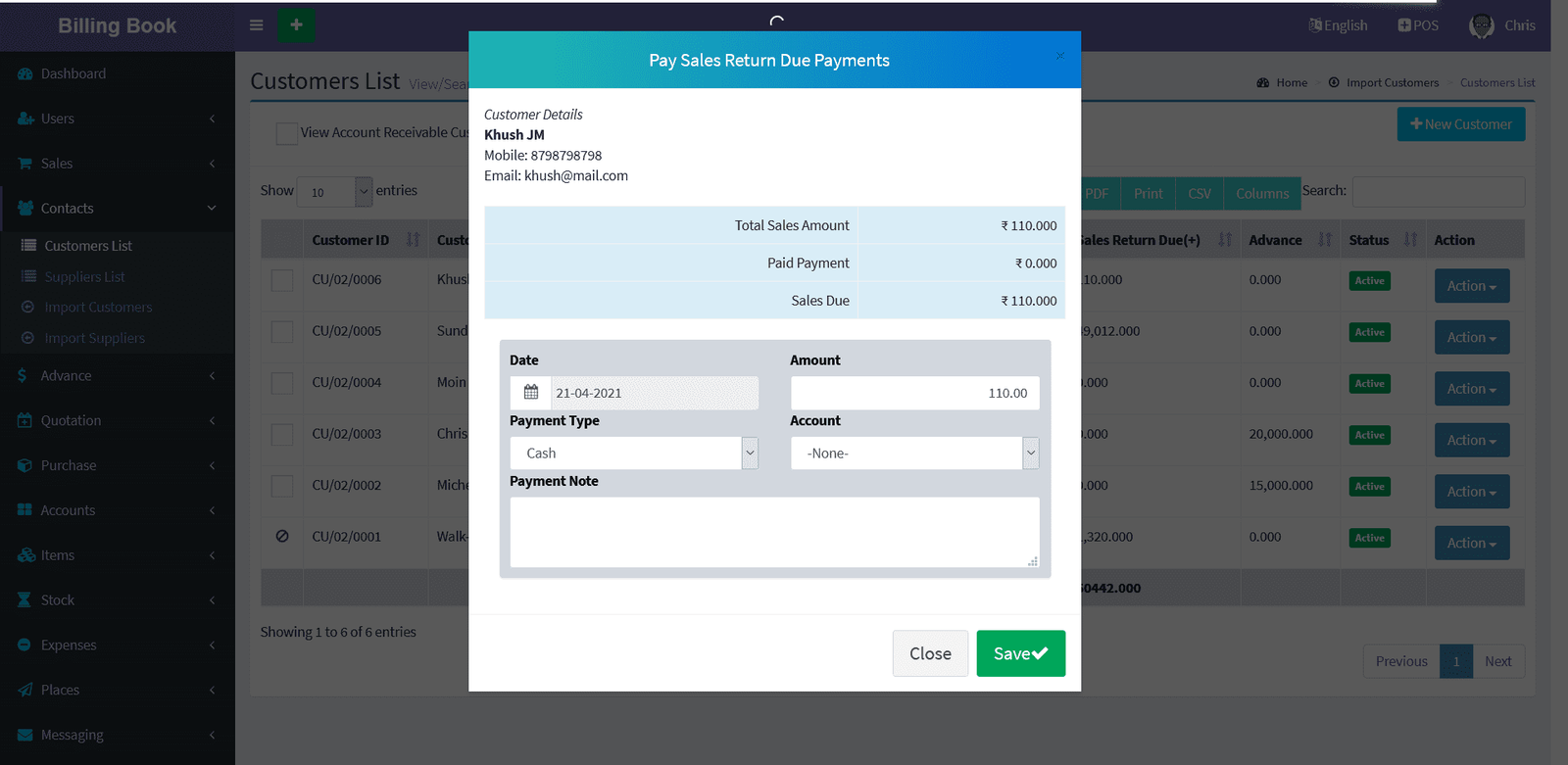 Customers -> Customers List -> Action Button -> Return Due Payments