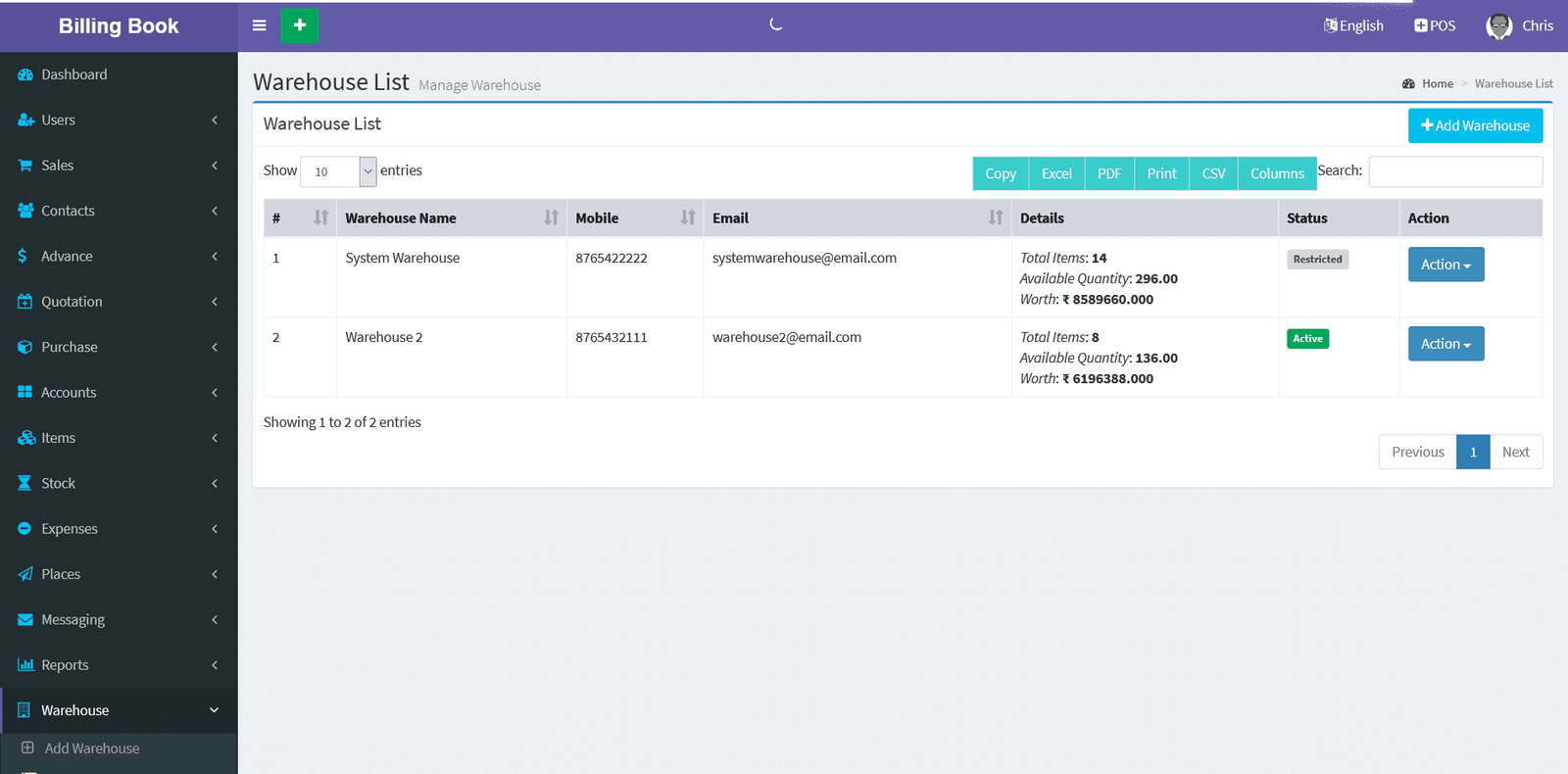 You can edit, delete, update the Warehouse details.